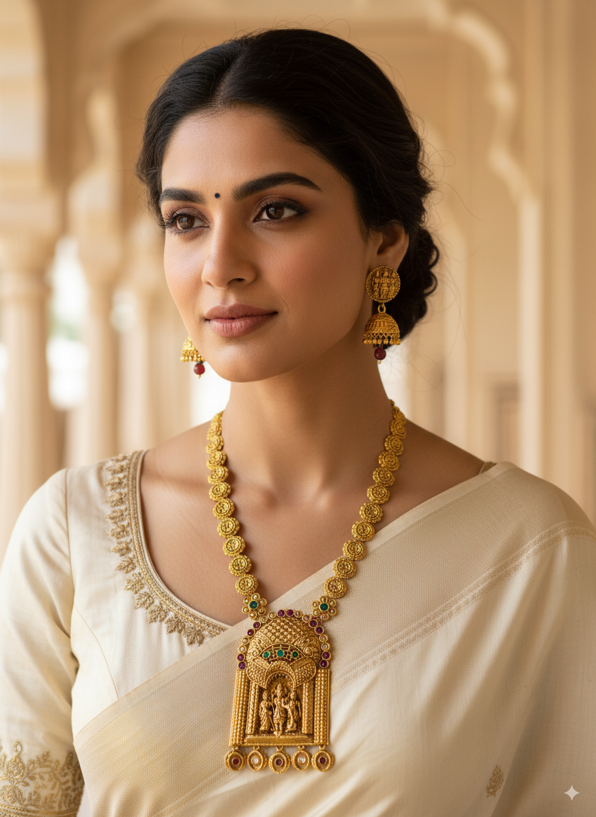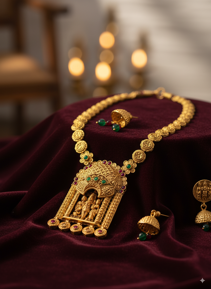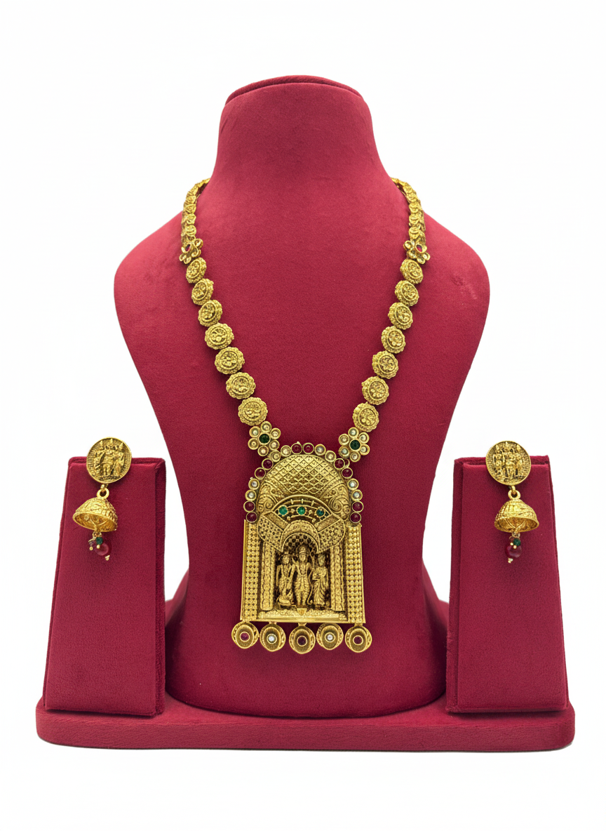 The Statement Royale Ram Darbar Necklace Set is a timeless piece of antique temple jewellery that blends devotion with elegance. Featuring the divine Ram Darbar — Lord Rama, Goddess Sita, Lord Lakshmana, and Hanuman — this gold plated long necklace with earrings is a perfect symbol of blessings, tradition, and grandeur.