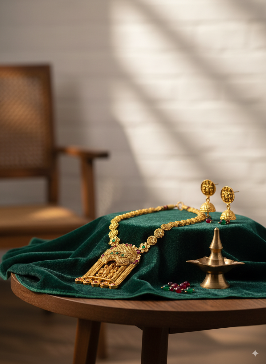Handcrafted with fine detailing, antique gold plating, and embellished with red and green stones, this statement temple jewellery necklace adds a majestic touch to bridal wear, wedding attire, festivals, and cultural occasions.