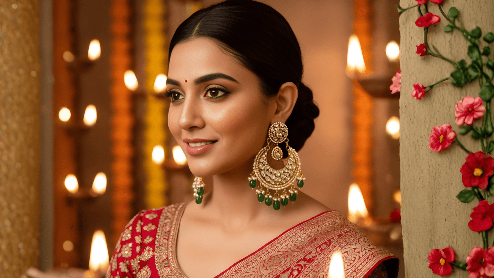 - Large chandbalis/jhumkas → Keep necklaces light.