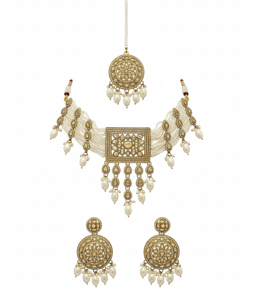 Step into royal elegance with this gold-plated kundan choker necklace set, adorned with intricate kundan work, pearl strands, and dangling pearl beads. The set includes a statement choker necklace, a pair of matching earrings, and a maang tikka ? making it the perfect choice for brides and festive occasions. Designed with a blend of heritage and luxury, this set adds timeless charm to your jewellery collection.