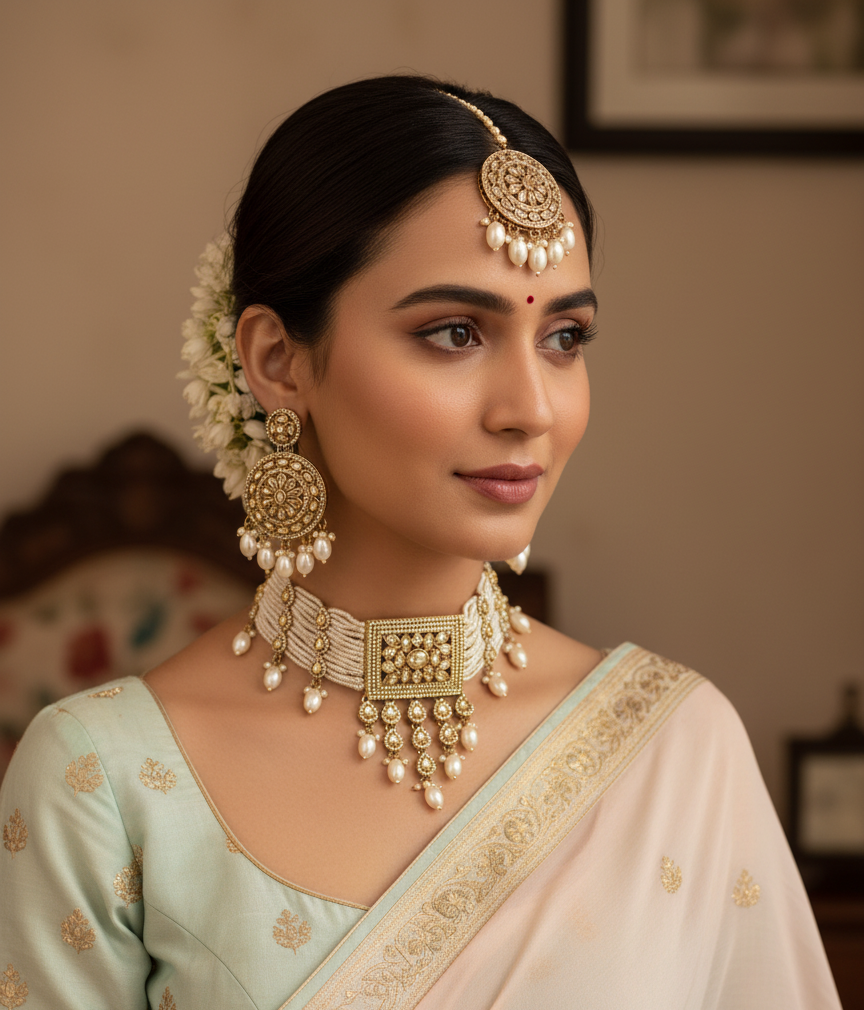 Complete Jewellery Set: Includes a kundan choker necklace, matching earrings, and maang tikka.