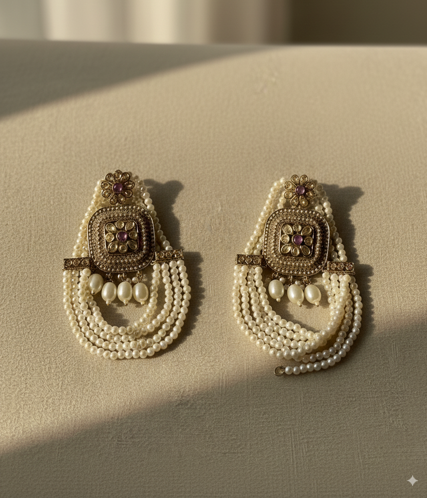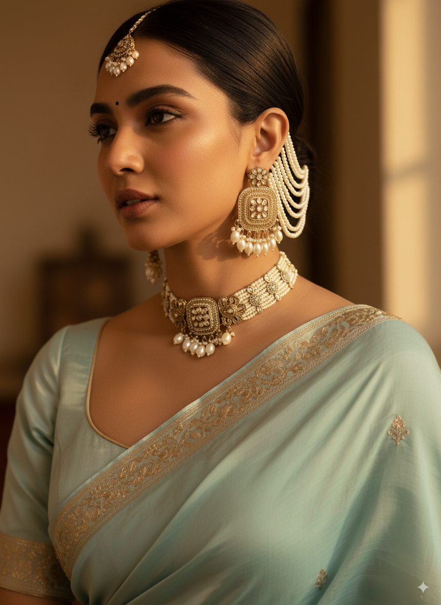 Premium Craftsmanship: Intricate gold-plated work with kundan stones and pearl strands.