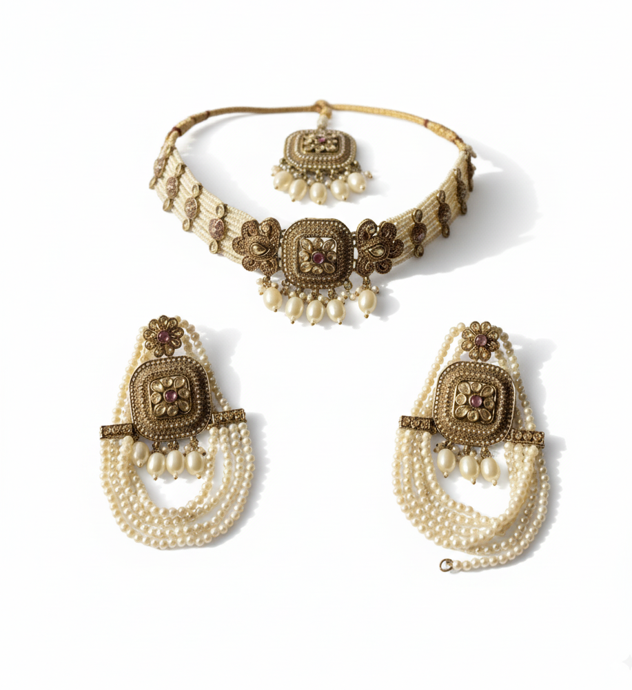 Bring regal elegance to your special occasions with this gold-plated kundan choker necklace set, adorned with sparkling kundan stones, pearl strands, and dangling pearl beads. This complete set includes a bold choker necklace, matching statement earrings, and a maang tikka ? making it the perfect jewellery set for brides, weddings, and festive occasions. With its handcrafted detailing and luxurious design, it adds timeless charm to any ethnic or bridal attire.