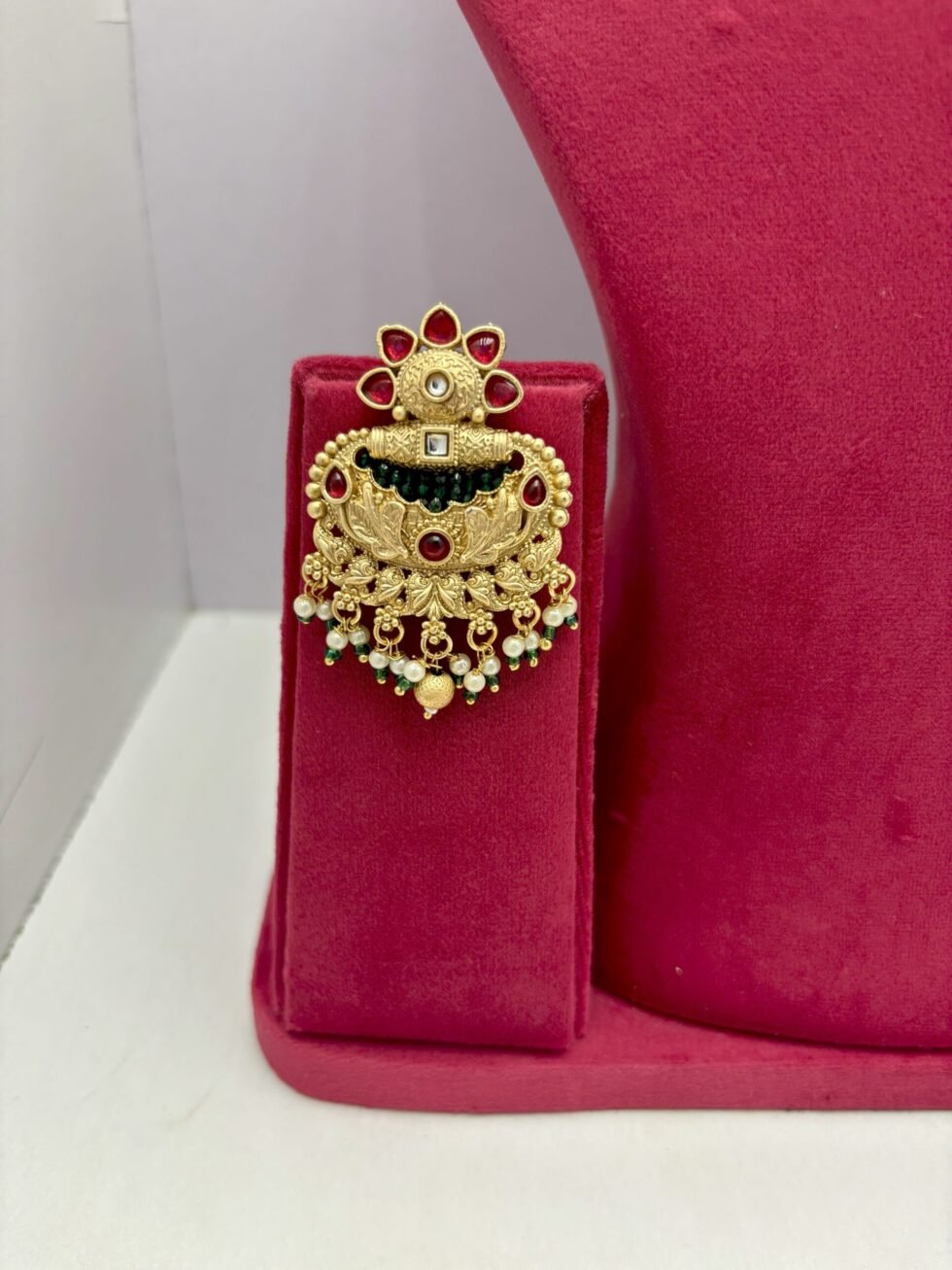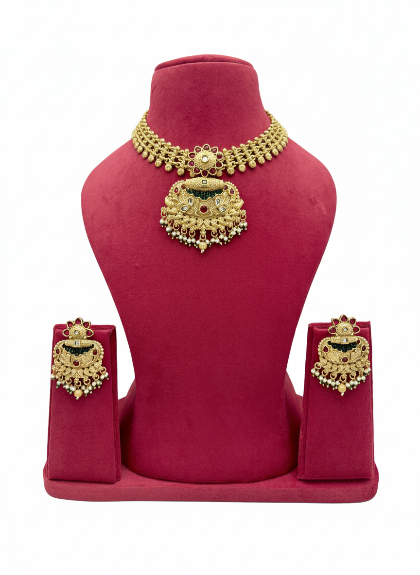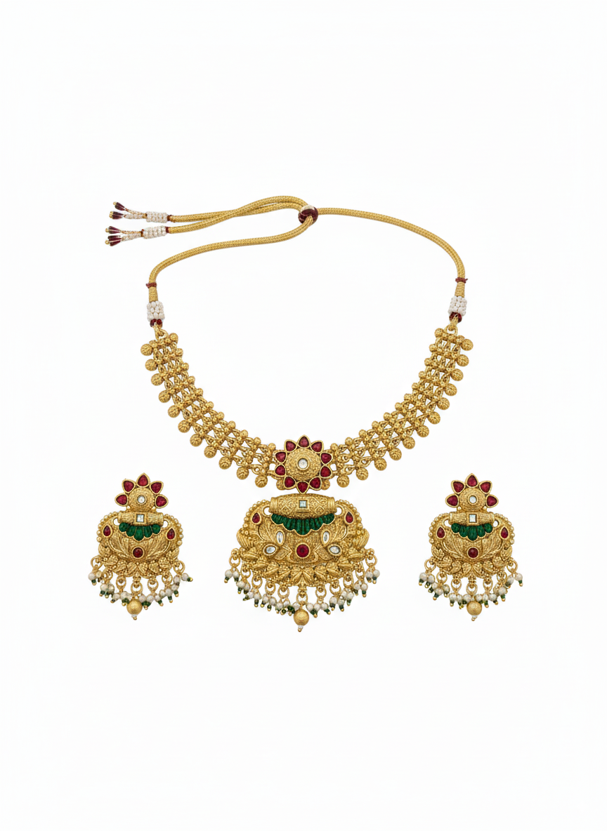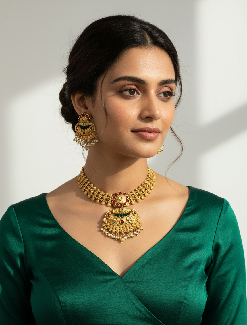 Traditional Temple Jewellery Design – Stunning choker necklace with detailed craftsmanship, paired with matching earrings inspired by South Indian heritage. Premium Gold Plating – Crafted on a strong copper alloy base with high-quality gold polish for durability and shine. Kundan and Pearl Detailing – Embellished with kundan stones, ruby/green accents, and pearl hangings for a rich and royal look. Complete Set – Includes one choker-style necklace with adjustable thread (dori) for comfort fit, along with a pair of matching earrings. Perfect for Bridal & Festive Wear – Ideal for weddings, engagements, cultural events, traditional celebrations, and gifting. Luxury Brand Packaging – Delivered in premium Statement Royale packaging to enhance the luxury jewellery experience.
