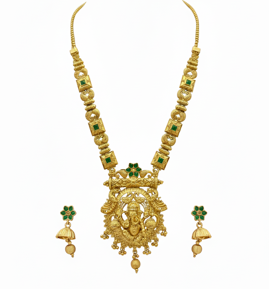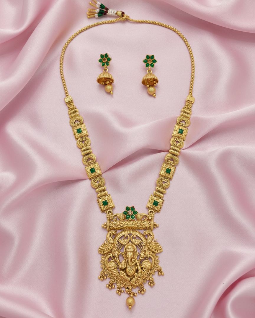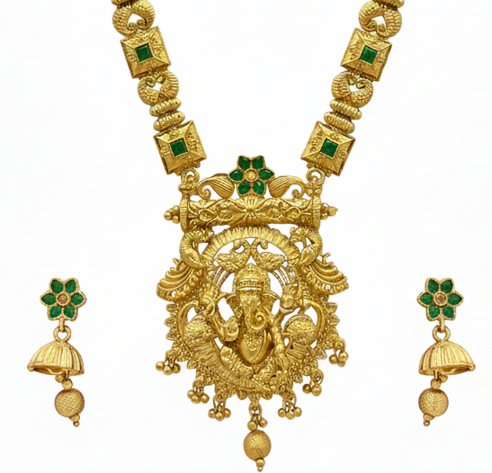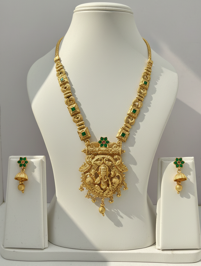 Celebrate divine elegance with this Temple Jewellery Set, featuring a long antique gold-plated necklace with a beautifully carved Lord Ganesha pendant and matching jhumka earrings. Embellished with green stones and intricate detailing, this heritage piece radiates blessings, prosperity, and tradition. Perfect for weddings, festive occasions, temple visits, and cultural celebrations, this set pairs beautifully with silk sarees, lehengas, and other traditional attire. With its timeless craftsmanship and divine symbolism, it?s a must-have for every jewellery lover?s collection.