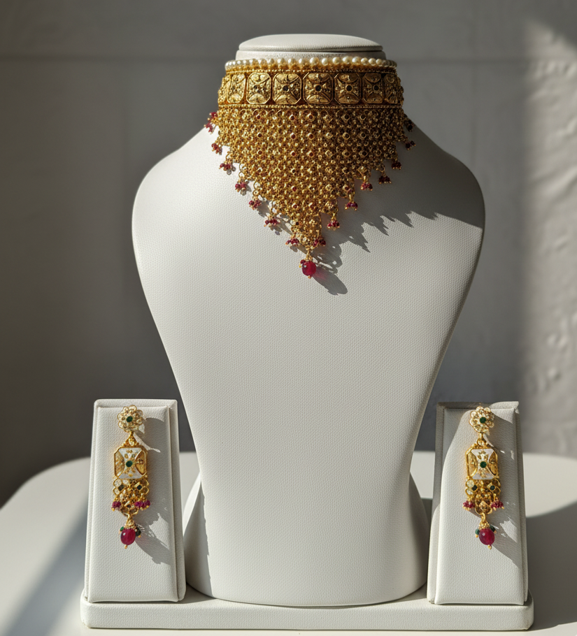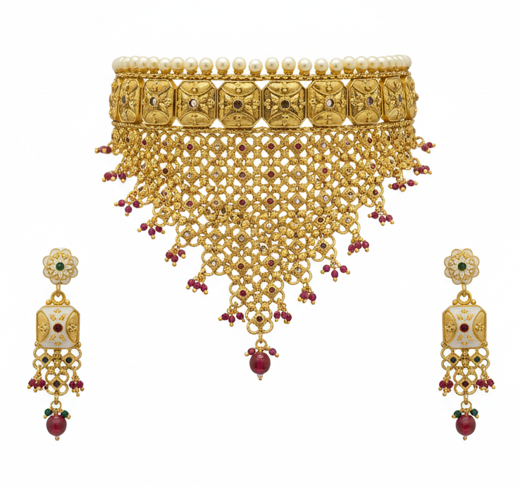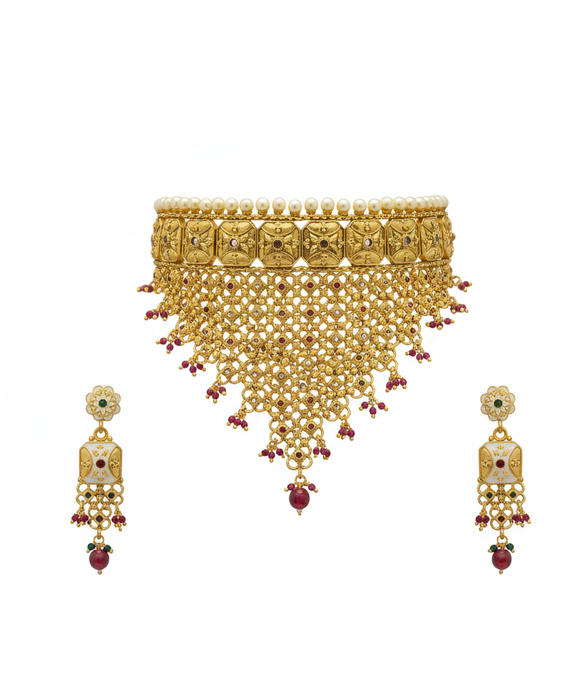 Add a touch of grandeur to your bridal and festive look with this luxurious gold-plated choker necklace set. Featuring intricate craftsmanship, embedded kundan stones, pearl accents, and a cascading mesh design, this set exudes timeless elegance. The statement earrings complete the royal ensemble, making it perfect for weddings, receptions, festive celebrations, and special occasions.