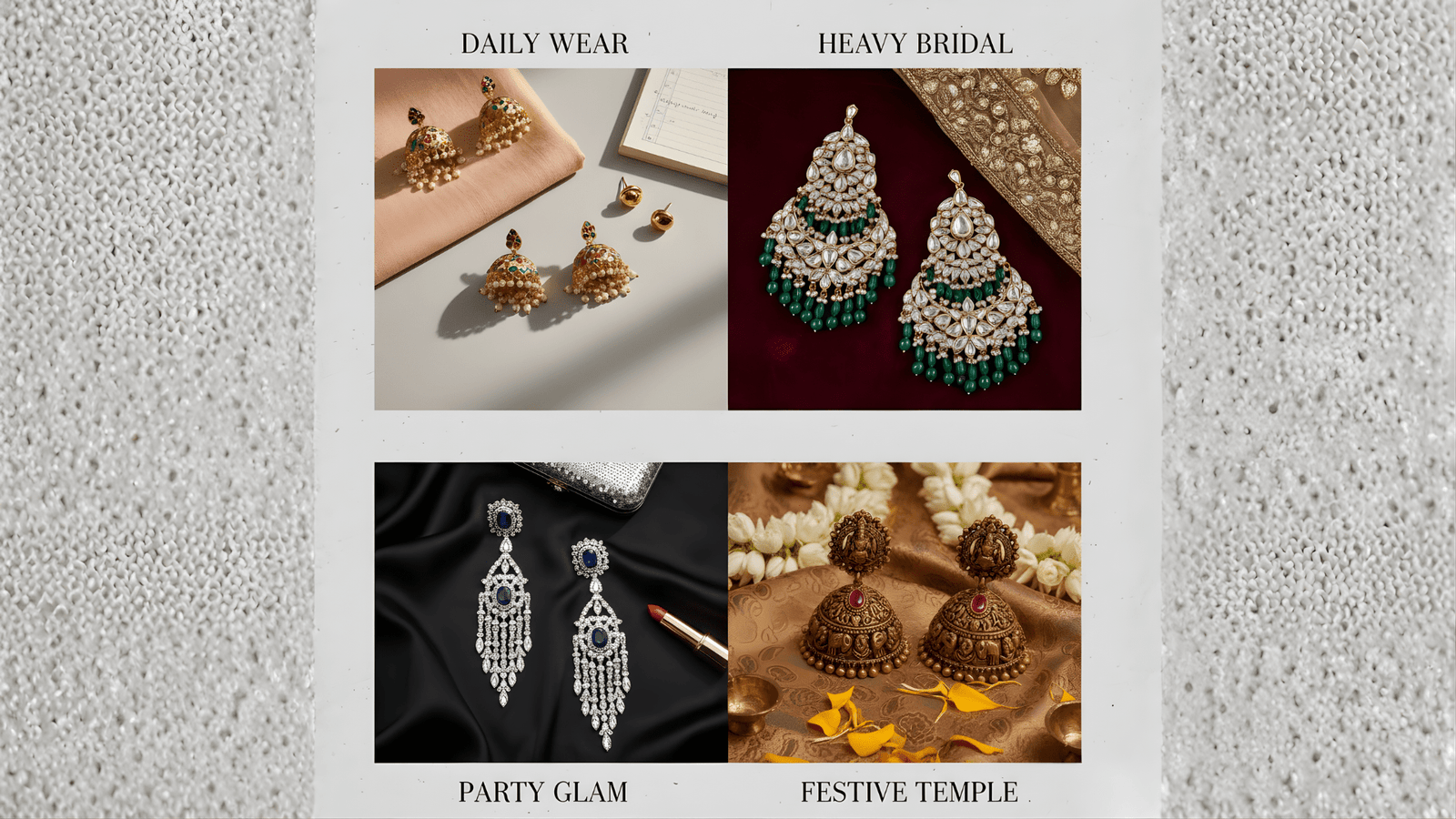 • Festivals: Antique temple jhumkas with kurtas or sarees.
