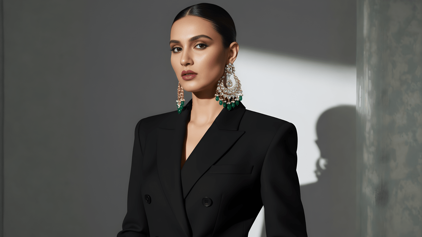 • Statement Earrings: Chandbalis and jhumkas for jumpsuits and blazers.