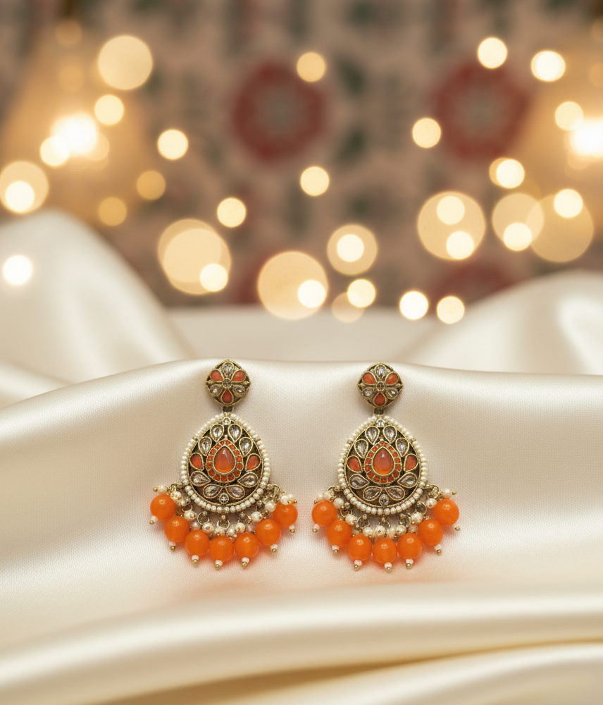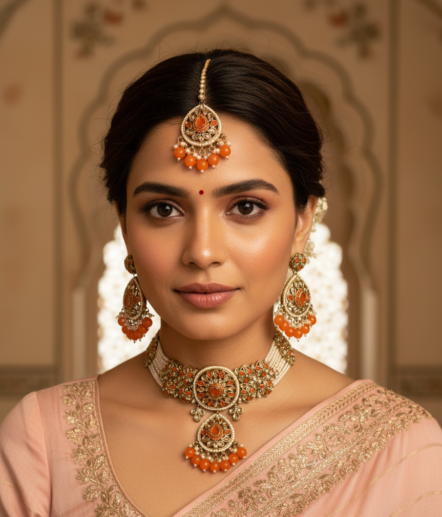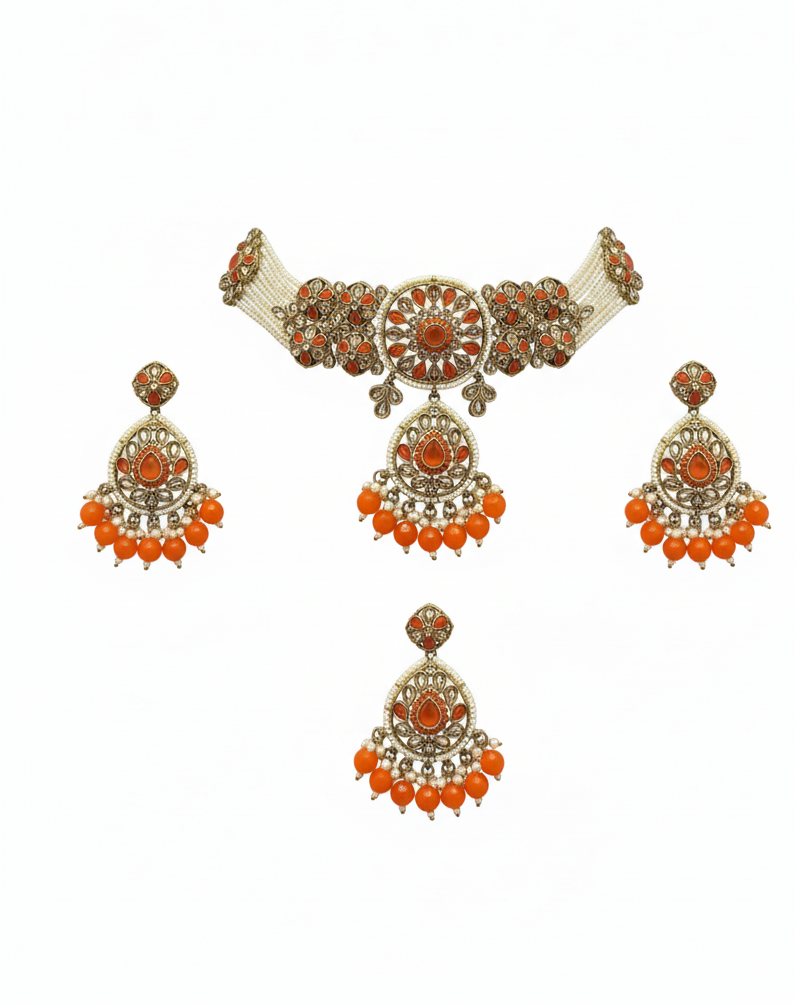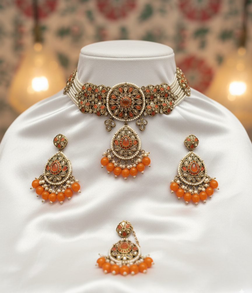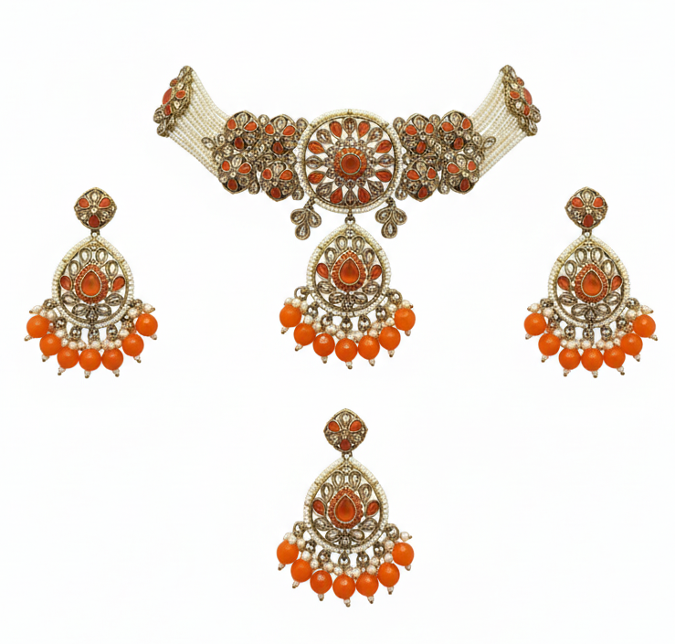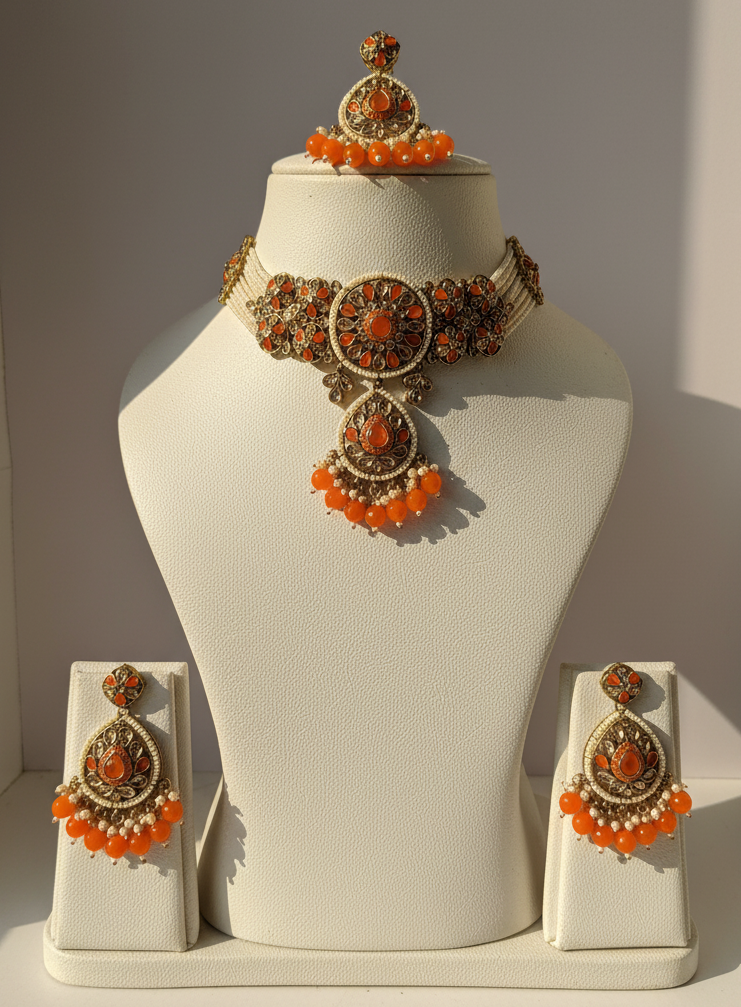 Bring vibrance and tradition to your look with this stunning gold-plated kundan choker necklace set, designed with intricate kundan stonework and bright orange bead accents. The set includes a choker necklace, a pair of matching earrings, and a maang tikka, making it a perfect choice for brides, festive celebrations, and grand occasions. Its vibrant color combination and handcrafted detailing make it a must-have statement piece in every jewellery collection.