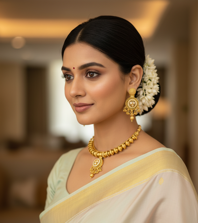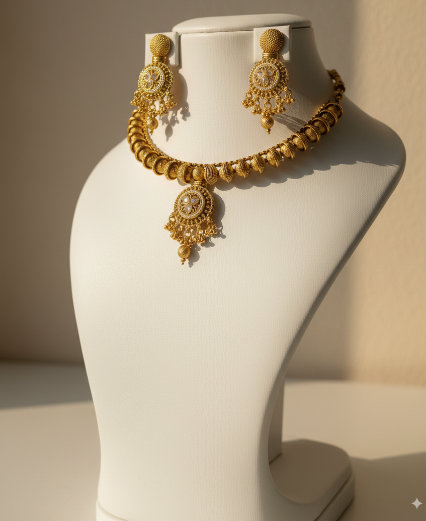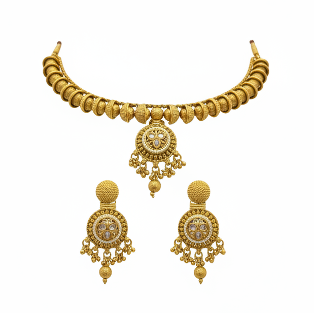 Elegant Choker Design: Traditional gold-plated choker with a circular motif centerpiece.