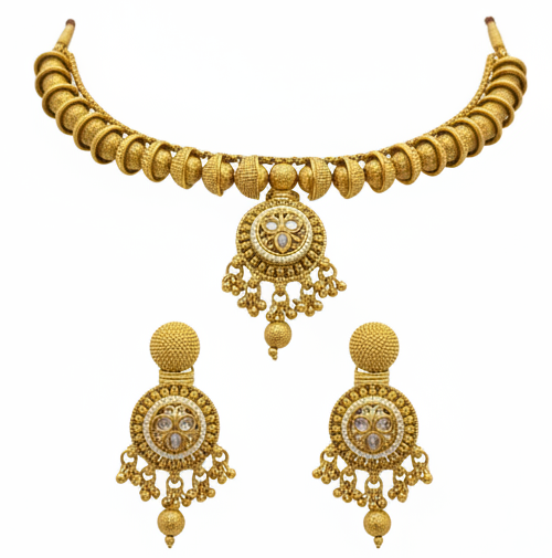 Add a royal touch to your festive and bridal look with this exquisite gold-plated choker necklace set. Crafted with detailed design elements and finished with antique polish, the choker features a circular motif embellished with kundan stones and delicate hanging beads. Paired with matching earrings, this set is perfect for weddings, festivals, and special occasions, giving you a timeless and regal appeal.
